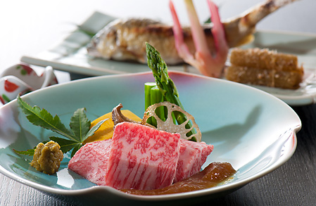 尾花沢牛や鴨などの地元産の食材を使った料理も楽しみのひとつ。